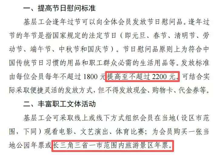 近日,江苏省总工会印发《关于进一步完善基层工会经费使用促进职工消费的若干意见》的通知,其中明确,职工节日慰问品发放标准由每位会员每年不超过1800元提高至不超过2200元。